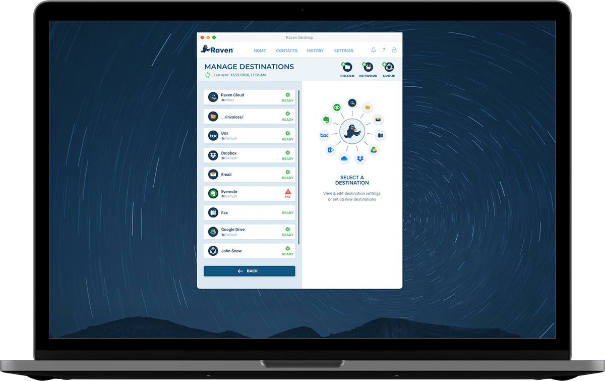 In addition to scanning to your computer or mapped network drives, Raven Desktop is fully integrated with Raven Cloud, Google Drive, SharePoint, OneDrive, Dropbox, Evernote and more.